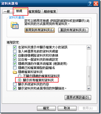 1. 請先設定 ”資料夾選項” à勾選 “顯示所有檔案和資料夾” à 確定