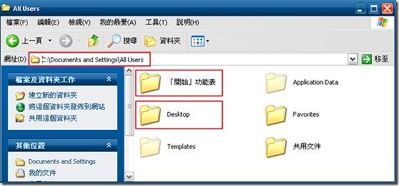 2. 找到 “C:\Documents and Settings\All Users”, “All User”下面的東西Sysprep不會去清除,所以可以將你想要放的檔案或是捷徑放在這裡。