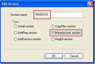2. 在Section name 填上 “RENESAS” , 並選擇 Type as “Manufacturer section”如下圖所示 , 然後按 “OK”.